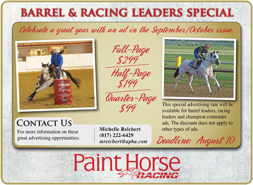 Special rates for barrel ads $99-299. Racing Leaders/Champion Contenders ads for